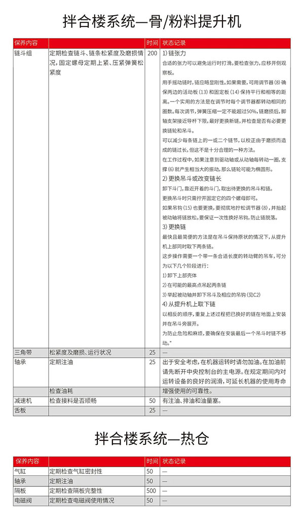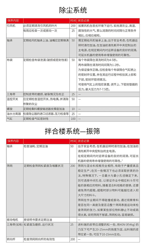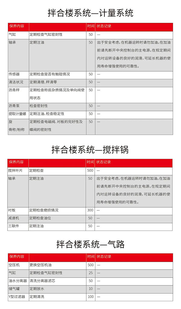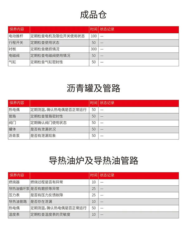 对于设备的保养不只是单单给轴承补充黄油、检查填充减速机油之类的简单工作。想要一台持续维持在最佳状态的沥青搅拌设备,需要对设备每个部件进行整体性、系统化的检查与维护,才能降低设备故障率,避免在后期运行中产生各种问题。以下是婷庭五情天综合免费为您精心整理的《设备保养计划表》,可以让您的设备保养更科学,更清晰。