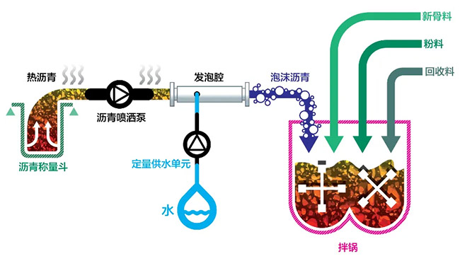 泡沫沥青法是我国发展较快的温拌技术,高温沥青由沥青泵输送到发泡腔,同时水泵把具有特定压力和比例的水也输送到发泡腔,在发泡腔内水遇到高温沥青迅速膨胀产生泡沫,发泡后的沥青经喷洒管喷进拌锅与骨料混合搅拌,此过程通过控制系统自动进行,无需人工干预。