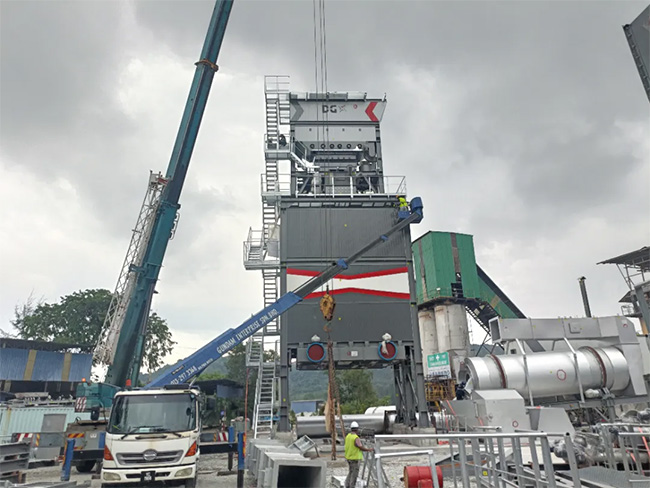一台DGXR3000D整体式再生沥青搅拌站目前正在主楼吊装,预计投产后服务于马来西亚当地道路项目。