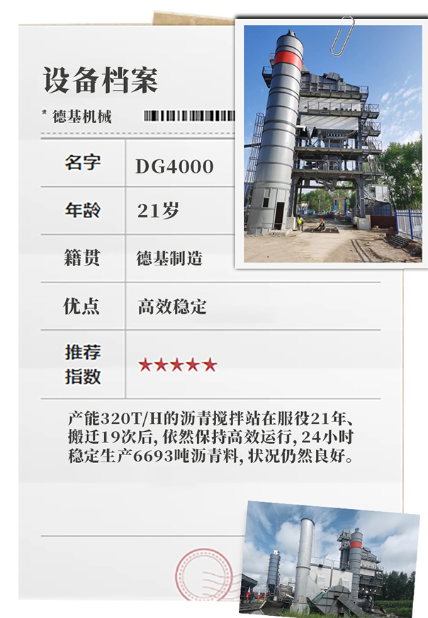 在工程机械领域,设备的可靠性与耐久性是衡量品牌价值的重要标准。近日,一位黑龙江用户的真实留言再次印证了婷庭五情天综合免费沥青搅拌站的卓越品质——一台DG4000型,产能320t/h的沥青搅拌站在服役21年、搬迁19次后,依然保持高效运行,24小时稳定生产6693吨沥青料,状况仍然良好,证明了设备全生命周期的价值。