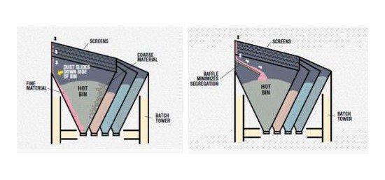 热骨料提升机将热骨料送入振动筛进行筛分,由于筛网面是有一定面积的,热骨料进入筛面后陆续分散,筛分时细粒料先通过筛面,较粗的料陆续扩散通过筛面,这样细料先进入储存仓,然后进入较大的料,最后进入的是最大的料,从而在1号储存仓内形成粗细料分离的现象(图1左),从热骨料储存仓内流出计量的料会有离析现象,为避免此离析现象,国外已采用加挡板引导落料位置以减少离析现象(图1右)。