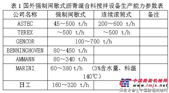 强制间歇式沥青混合料搅拌设备是以搅拌锅的容量来定义的,国外最大搅拌锅的容量是7000kg,但也仅是一台样机而言,国外多数公司生产的最大搅拌锅容量为4000 kg、5000 kg,6000 kg仅为少数,表1为国外主要几家厂商的强制间歇式沥青混合料搅拌设备生产能力参数表,大容量的搅拌设备适用于商品混合料的供应模式,且大生产能力的沥青混合料搅拌设备大多是连续滚筒式搅拌设备。