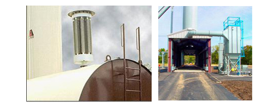 沥青混合料在拌制过程中沥青一般要加热到150℃~180℃,成品沥青混合料的温度通常在140℃~160℃,沥青加热后会挥发出沥青烟气,因此在沥青路面铺装的搅拌、摊铺、碾压过程中均会挥发出沥青烟气,沥青烟气中含有对人体有害的多环芳烃等碳氢化合物,多环芳烃的排放量是随温度的变化而变化的,温度越高排放量增加,2-3环芳烃的挥发温度是140℃~160℃。欧美国家沥青混合料搅拌设备污染排放不仅对除尘器的排放加以控制,还对沥青储罐、成品料装车区、成品料储罐顶部的排放均加以控制处理,使之排放达到要求。图2是沥青储罐和成品料装车区排放控制处理装置图。