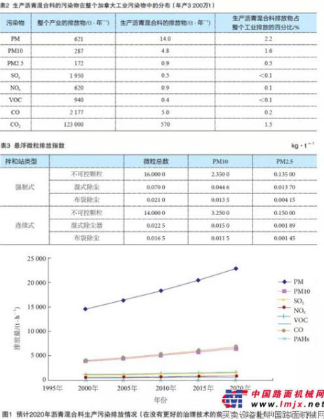 加拿大对沥青搅拌设备排放也做了大量研究,得出了许多重要结论,如:生产沥青混合料时产生的污染物分别占整个加拿大工业排放PM、PM10和PM2.5总数的2.2%、1.6%、0.5%。如果采取有效的控制技术和尘埃管理条例,悬浮微粒相对于2000年降低81%是可能的。表2~3和图1为加拿大研究人员的部分研究结论。