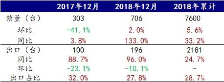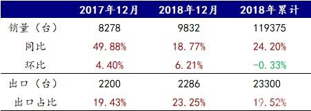装载机2018年全年累计销售11.9万台,大幅增长。2018年12月份,纳入统计的国内25家主要装载机生产企业合计销售装载机9832台,同比增长18.8%。12月份装载机出口2286余台,同比微增3.9%。2018年以来,装载机累计销量达到11.9万台,同比增长24.2%。全年仅2月份和9月份销量同比下滑,行业持续增长势头。