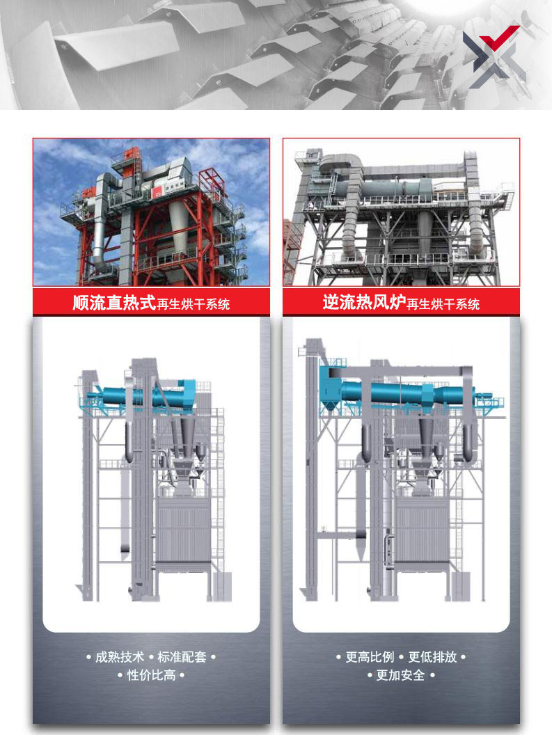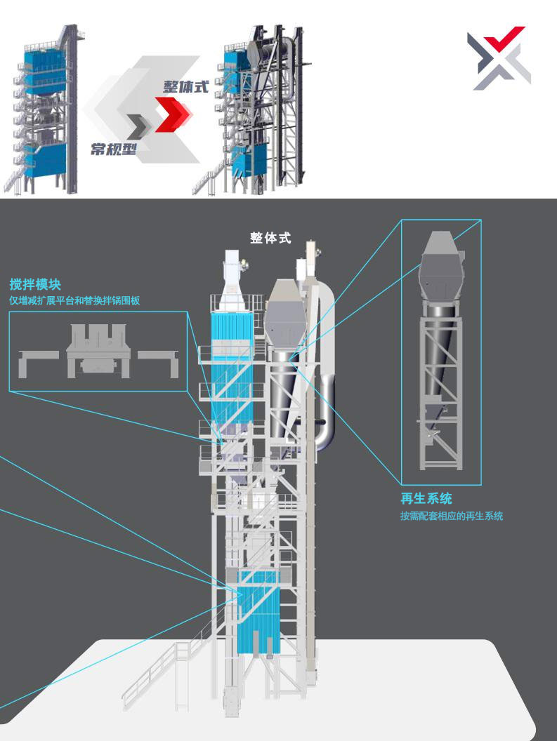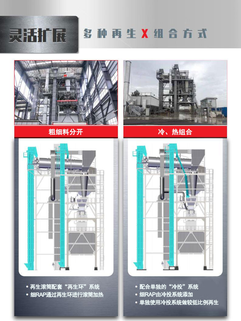 采用「整体式」设备进行再生沥青混合料生产,具有得天独厚的优势,对于明确需要使用再生的用户而言,毫无疑问会选择「整体式」设备。但并非所有用户都有再生的需求,至少在目前可能暂时还用不到再生,对于这类用户而言,在设备选型时往往会陷入两难的境地。到底是优先满足当前需要选择「常规型」,还是长远规划一步到位选择 「整体式」。