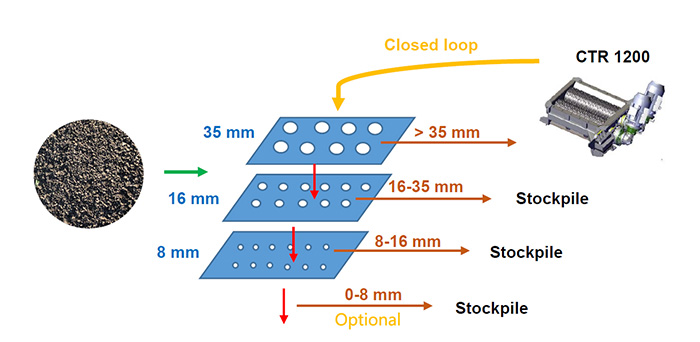 针对铣刨料中已含有大量细料,故RAP齿辊破碎筛分设备采用先筛分后破碎的工艺流程,即对铣刨料先进行筛分,将超规格料进行破碎并再次筛分的闭环工艺流程。